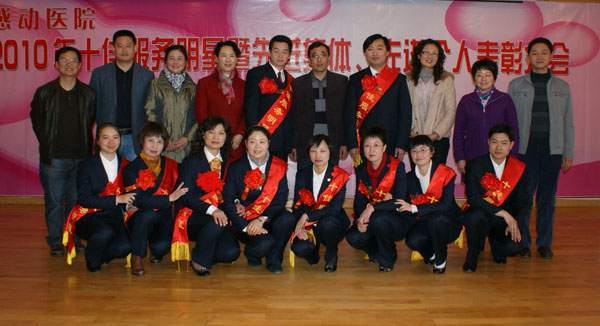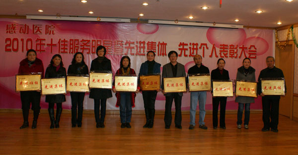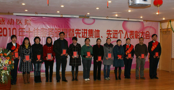 2011年1月27日我院召开2010年十佳服务明星暨先进集体、先进个人表彰大会。市卫生局许局长、雷副书记,院领导与受表彰的十佳服务明星合影