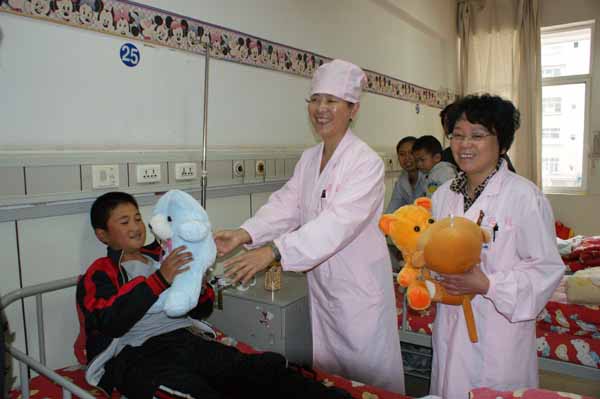 上午9点,院领导走进儿科病房,将价值3200元的玩偶、公仔等礼物送给患儿,带去医院的关爱和祝福,与患儿家长亲切交谈,安抚和鼓励小朋友们战胜病魔,早日康复,受到家长和小朋友们的热烈欢迎。