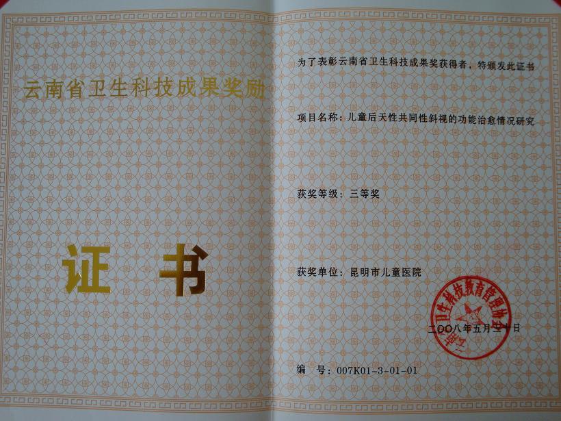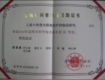 3、科研项目:“儿童小角度内斜视的临床研究”获`2010年昆明市科技进步三等奖。