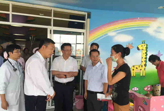 院长张铁松(右二)陪同下参观新阳光病房学校和彩虹桥玩具图书传爱站