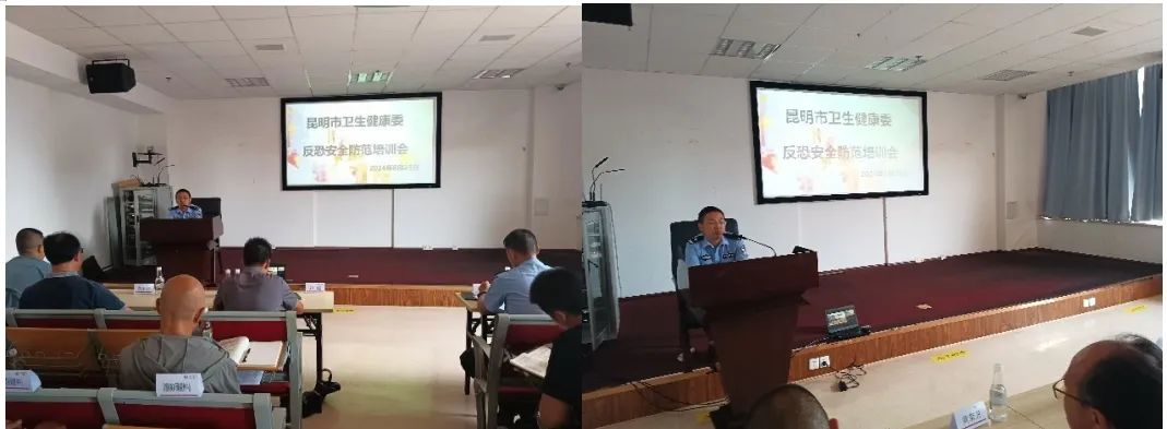 培训分为七个议程进行,议程一:昆明市卫生健康委应急处刘源处长进行了培训会启动发言。他通报了 2024 年以来,在省、市反恐怖督导检查中出现的若干共性问题,着重强调了反恐怖安全防范工作的重要性。与此同时,刘源处长对医院反恐工作提出了更高的要求与期望。