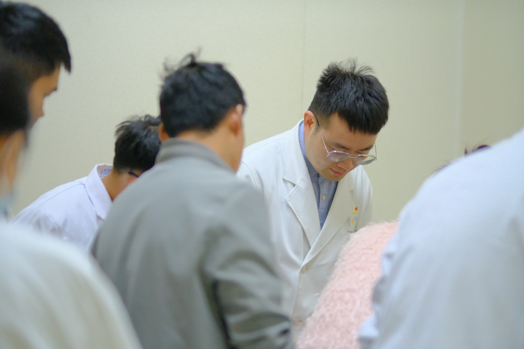 新生儿科专家团队进入产科病房查房,向云桥医院医护人员教授新生儿体检经验,如何评估新生儿心肺功能,查看黄疸迹象,指导家长如何防止新生儿吐奶和呛奶。